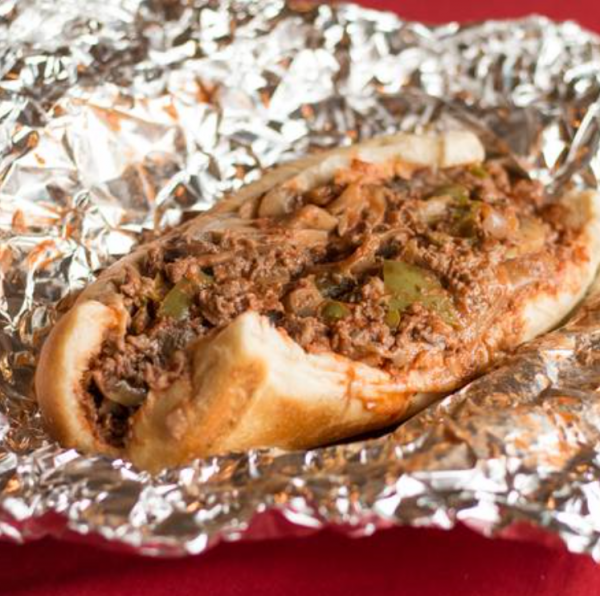 Thin slice steak smothered in pizza sauce on a homemade roll.